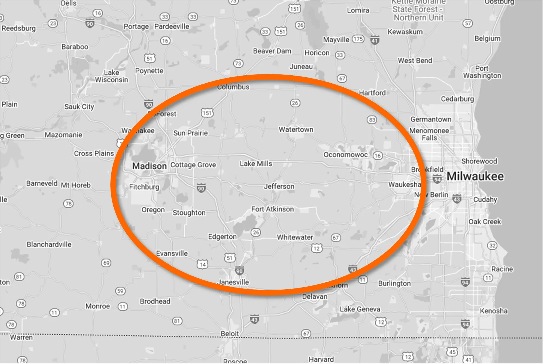 Madison, Middleton, Lake Mills, Cottage Grove, Oconomowoc, DeForest, Sun Prairie, Watertown, Jefferson, Fitchburg, Stoughton, Oregon, Edgerton, Janesville, Whitewater, and Waukesha